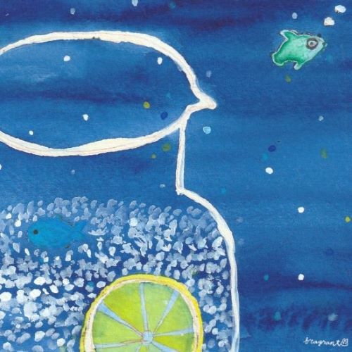 ブルーなカラーとレモンが涼しげな海の中のイラストです。