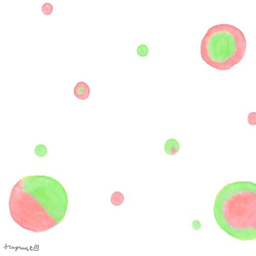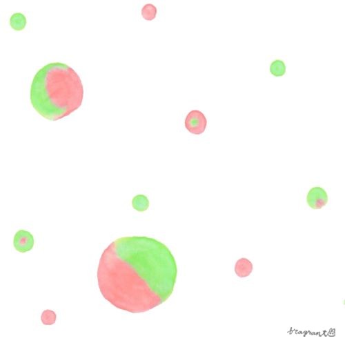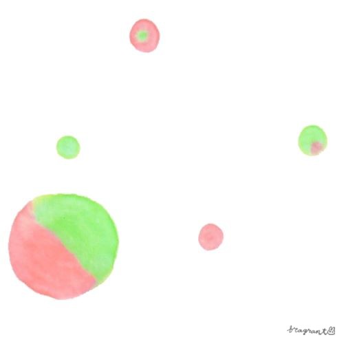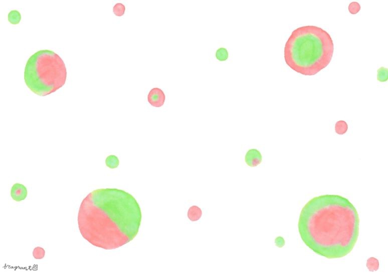 ピンク色と黄緑色が混ざり合った、飴玉みたいな粒のイラストです。